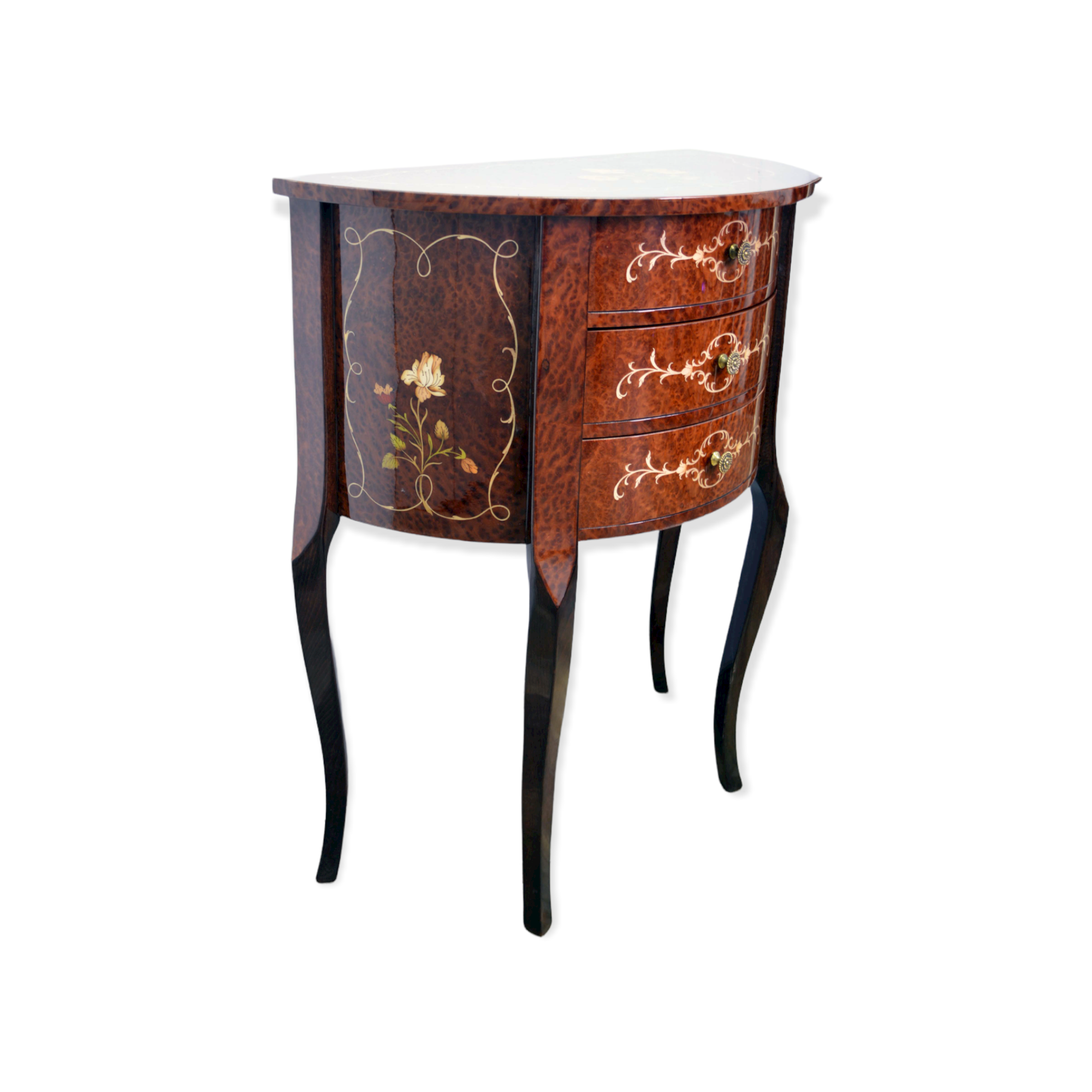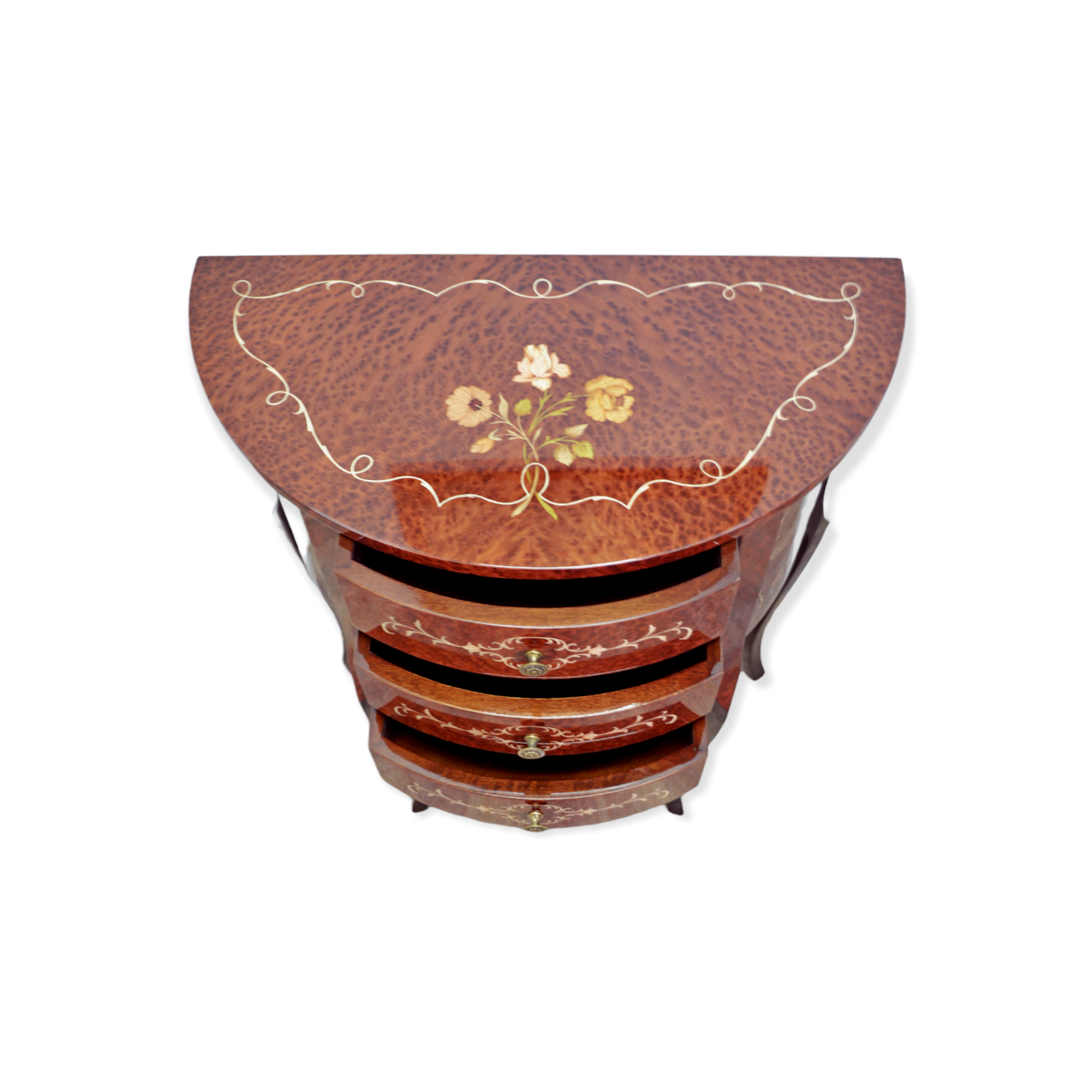 Small console “Mezzaluna”, inlaid with 3 drawers in fine vavona briar wood, floral motif inlay with bright colors and brillant gloss finish to enhance the colors and the precious briar.